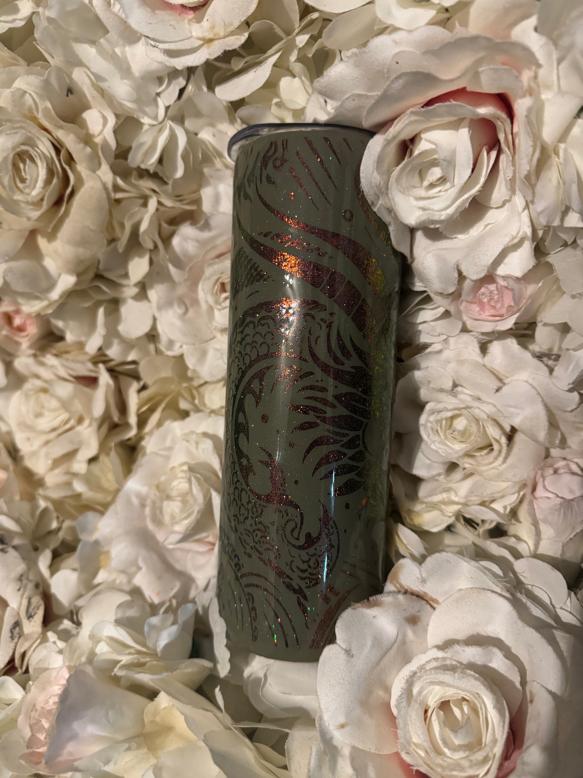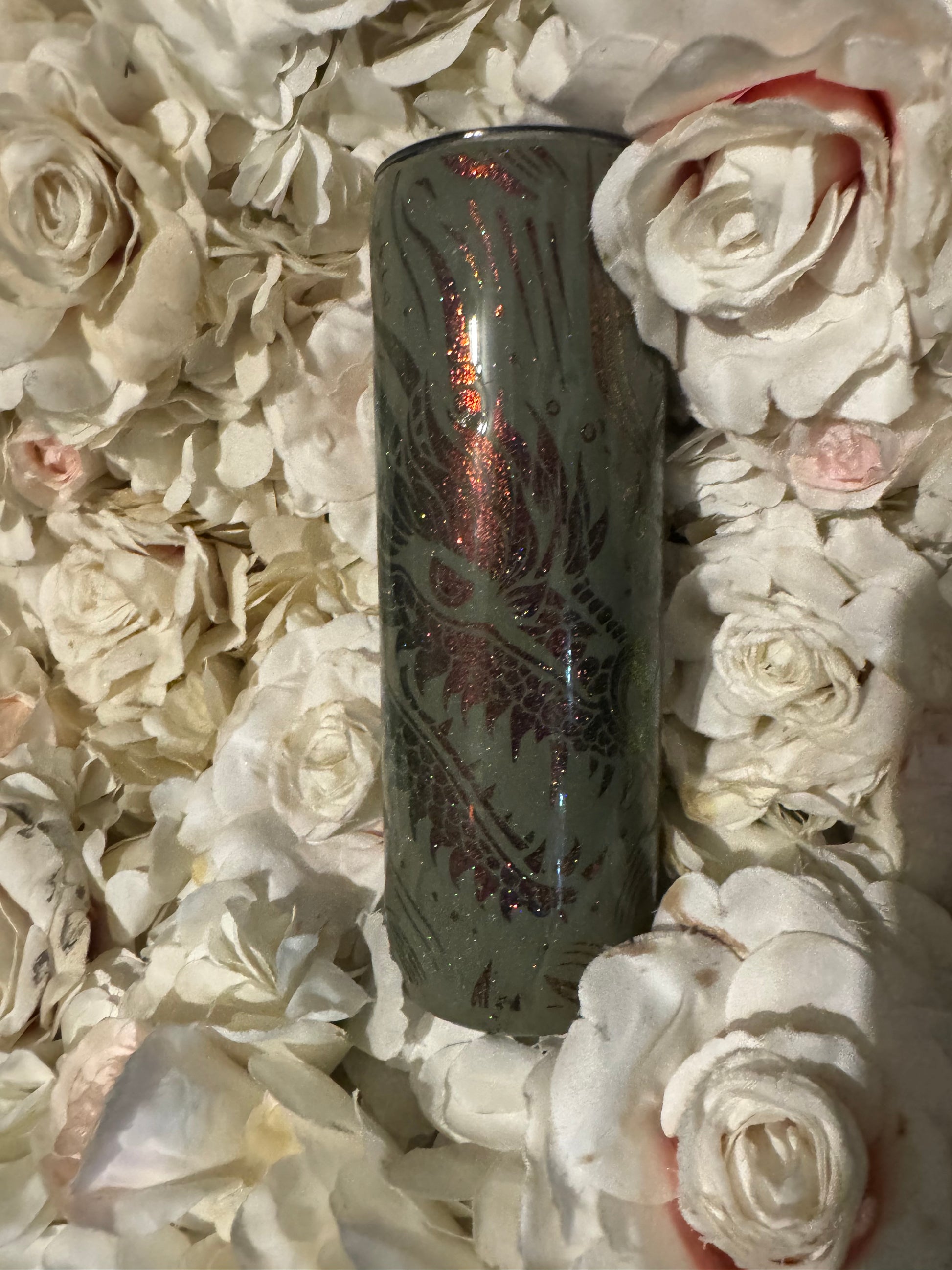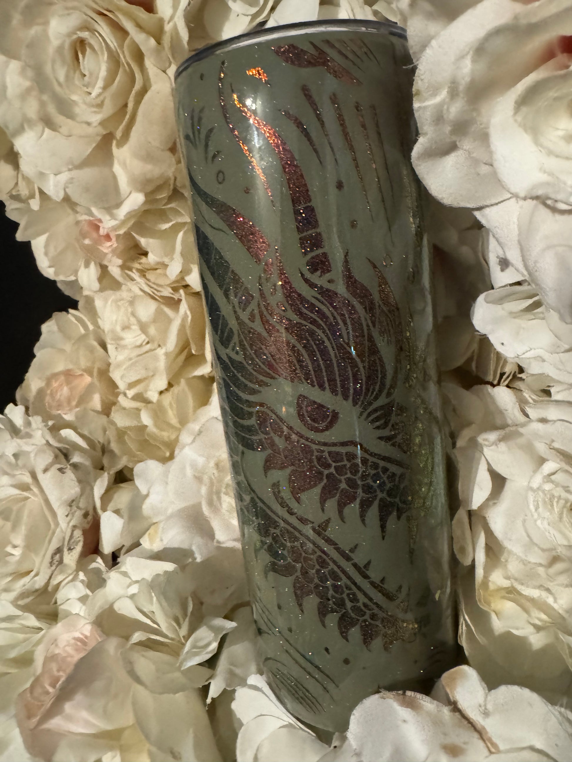 This 20oz tall skinny tumbler features a unique dragon colour shift peek a boo style, perfect for adding a touch of magic to your drinks. Its double walled design keeps your beverages at the perfect temperature.